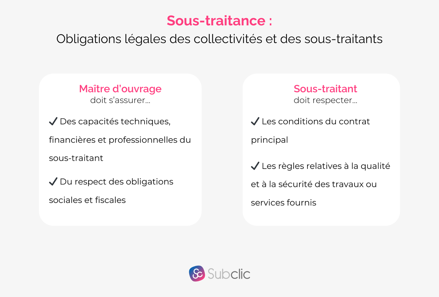 Les collectivités publiques, en tant que maîtres d'ouvrage, doivent s'assurer que le titulaire du marché respecte les conditions légales lors de l'engagement de sous-traitants. Parmi les obligations, il y a la vérification des capacités techniques, financières et professionnelles du sous-traitant, ainsi que le respect des obligations sociales et fiscales. De leur côté, les sous-traitants doivent respecter les conditions du contrat principal, ainsi que les règles relatives à la qualité et à la sécurité des travaux ou services fournis.